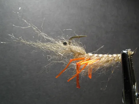 18. Make both antennas and shield back come forward to the hook bend. Secure with the ribbing and rib the fly towards the eye, making the turns closer and closer.